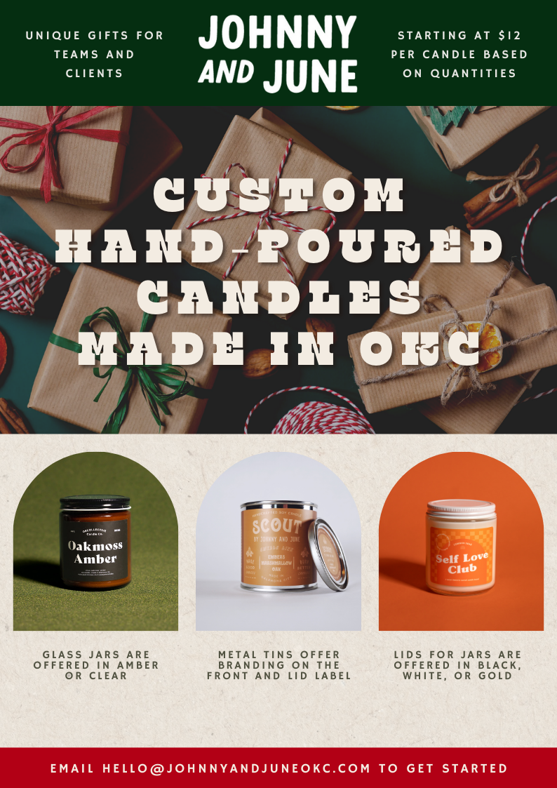 Perfect for corporate and small business teams and client appreciation gifts! Starting at $12 per candle based on quantities.