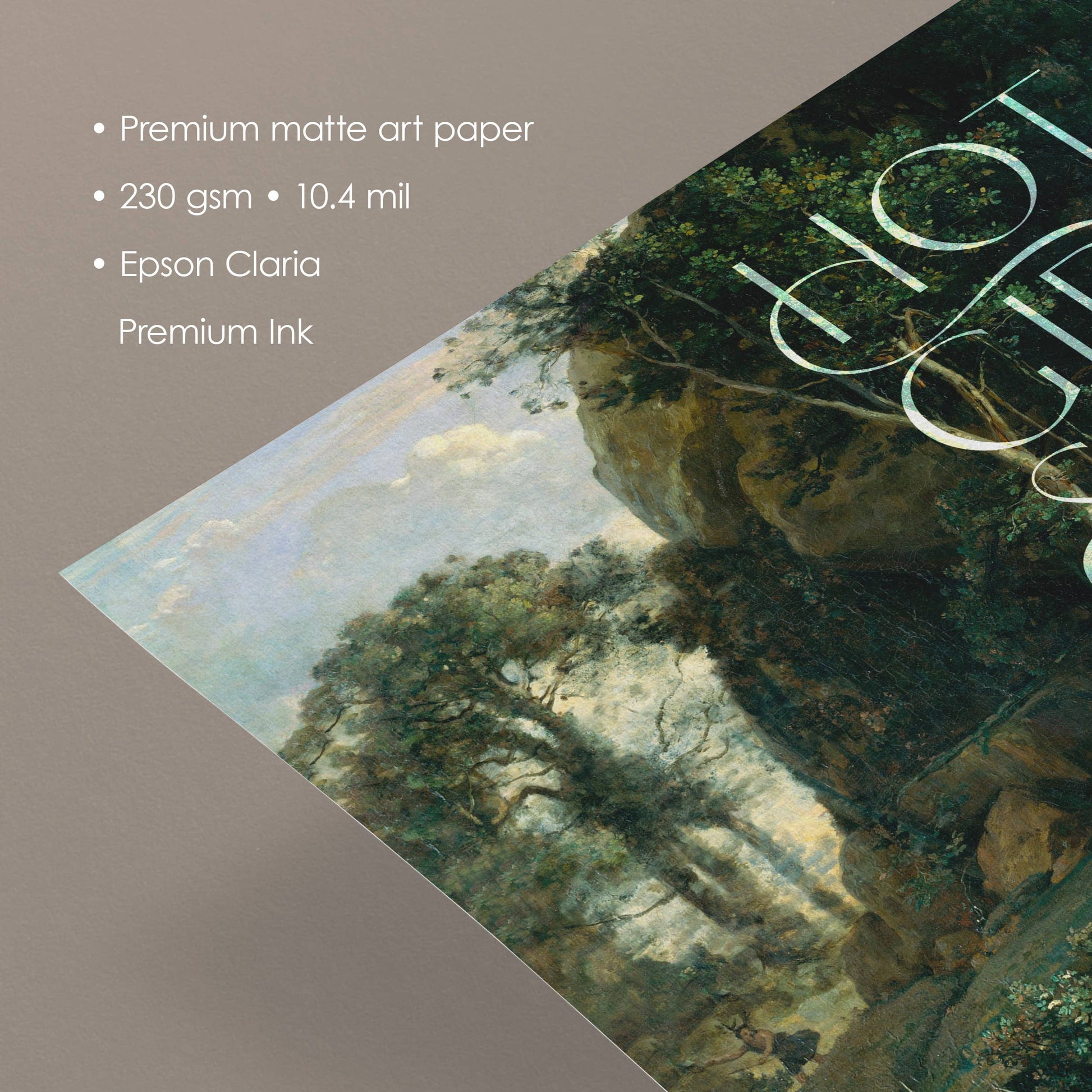 This fine art print features the classic painting by Camille Corot altered with the words "Hot Girl Shit" in elegant art nouveau style lettering. Diana and her nymphs bathe in pond surrounded by a lush green forest under a blue sky full of warm billowing clouds. The scene is imagined from Ovid's Metamorphoses. The design adds a subversive touch to any room decor.