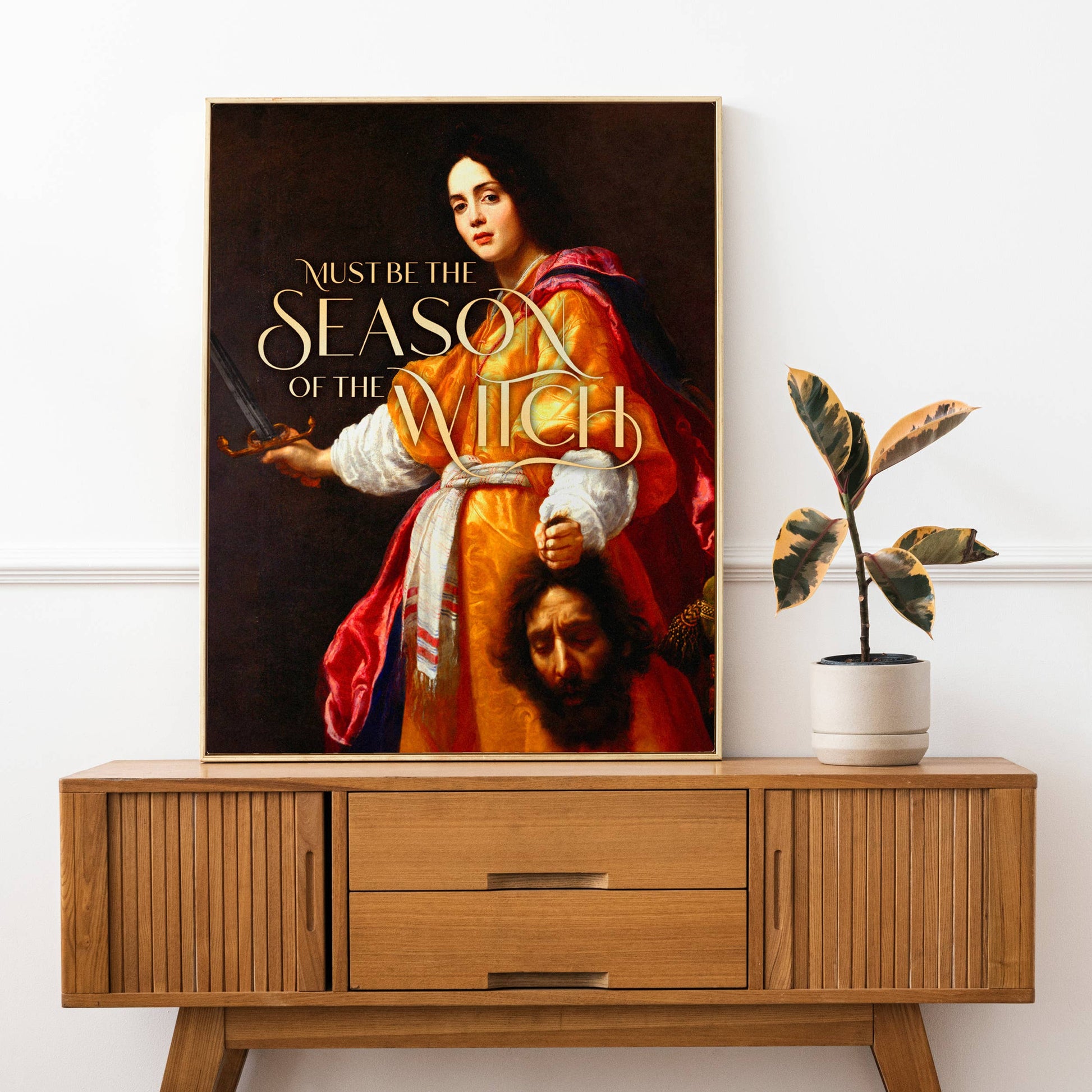 Featuring the classic painting, Judith with the Head of Holofernes, by Cristofano Allori accented with delightfully sassy type, "Must Be the Season of the Witch."